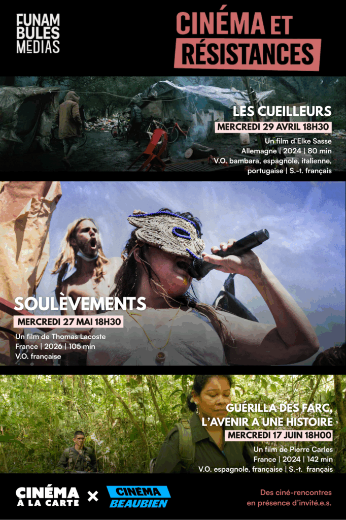 Cinéma et Résistances est une série de projections mensuelles qui met en lumière des enjeux sociaux contemporains à travers le cinéma documentaire. Chaque séance propose un film politique — Les cueilleurs d’Elke Sasse, Soulèvements de Thomas Lacoste, Guérilla des FARC, l’avenir a une histoire — abordant des réalités liées aux luttes sociales, aux droits des travailleur·euse·s et aux mouvements de résistance.
